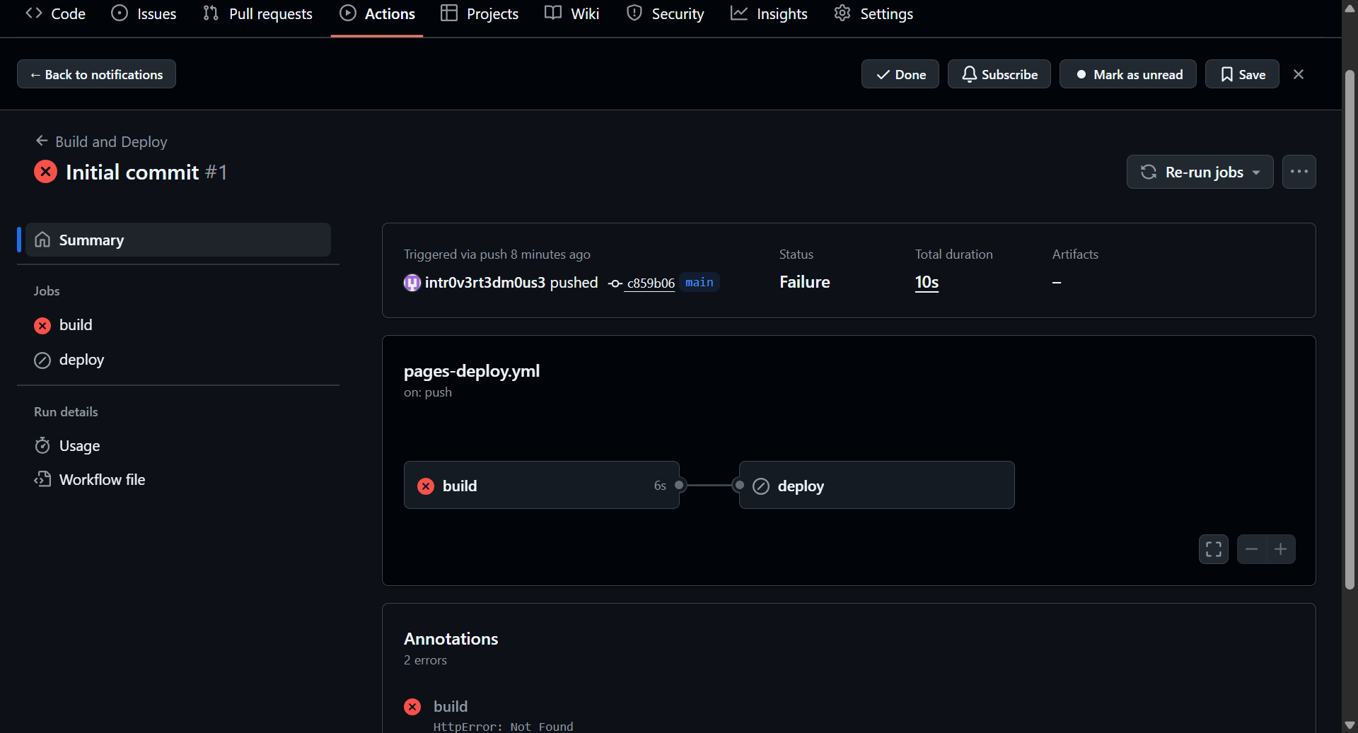 Note: After creating your repository from the template, you may see a build failure in GitHub Actions like the one shown below. This is expected and will be resolved once you commit and push your configuration changes in Step 2.